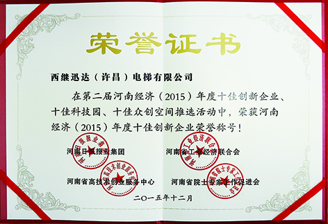 在2015年12月18日召開的河南省第四屆產業集聚區高峰論壇上,西繼迅達電梯被授予“河南經濟2015十大創新企業”稱號,并獲得大會表彰。