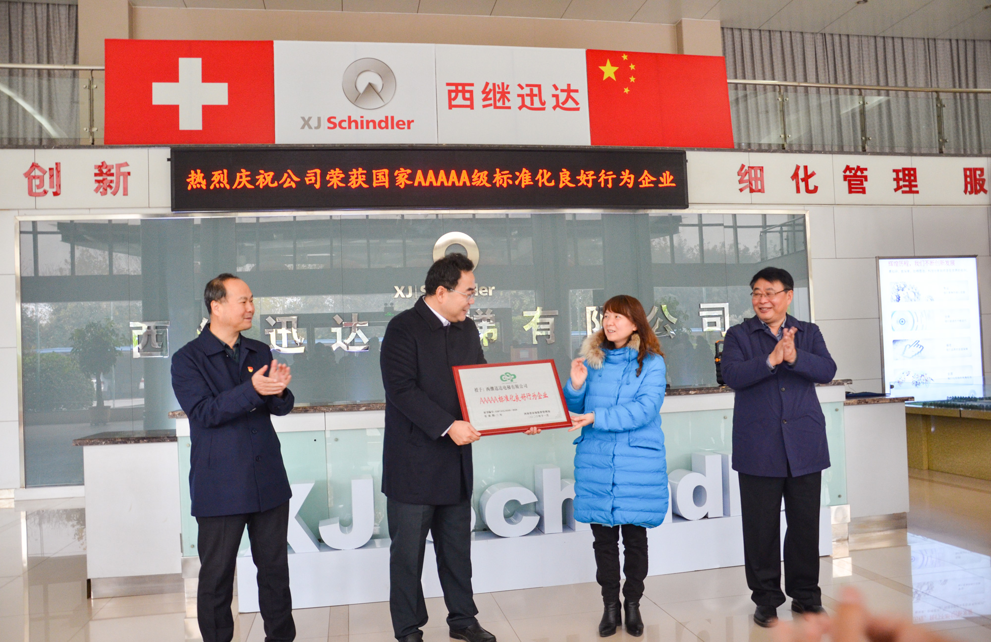 11月30日上午,河南省市場監管局標準化處李莉處長一行,在許昌市市場監管局黨組書記、局長田德海,開發區管委會主任蔚鐘聲的陪同下蒞臨西繼迅達電梯,親自為西繼迅達AAAAA級標準化良好行為企業授牌。