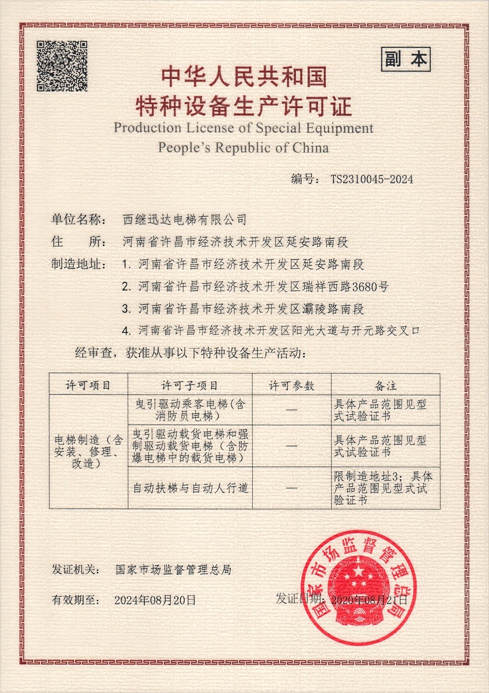 西繼迅達電梯順利完成特種設備生產許可證換證工作