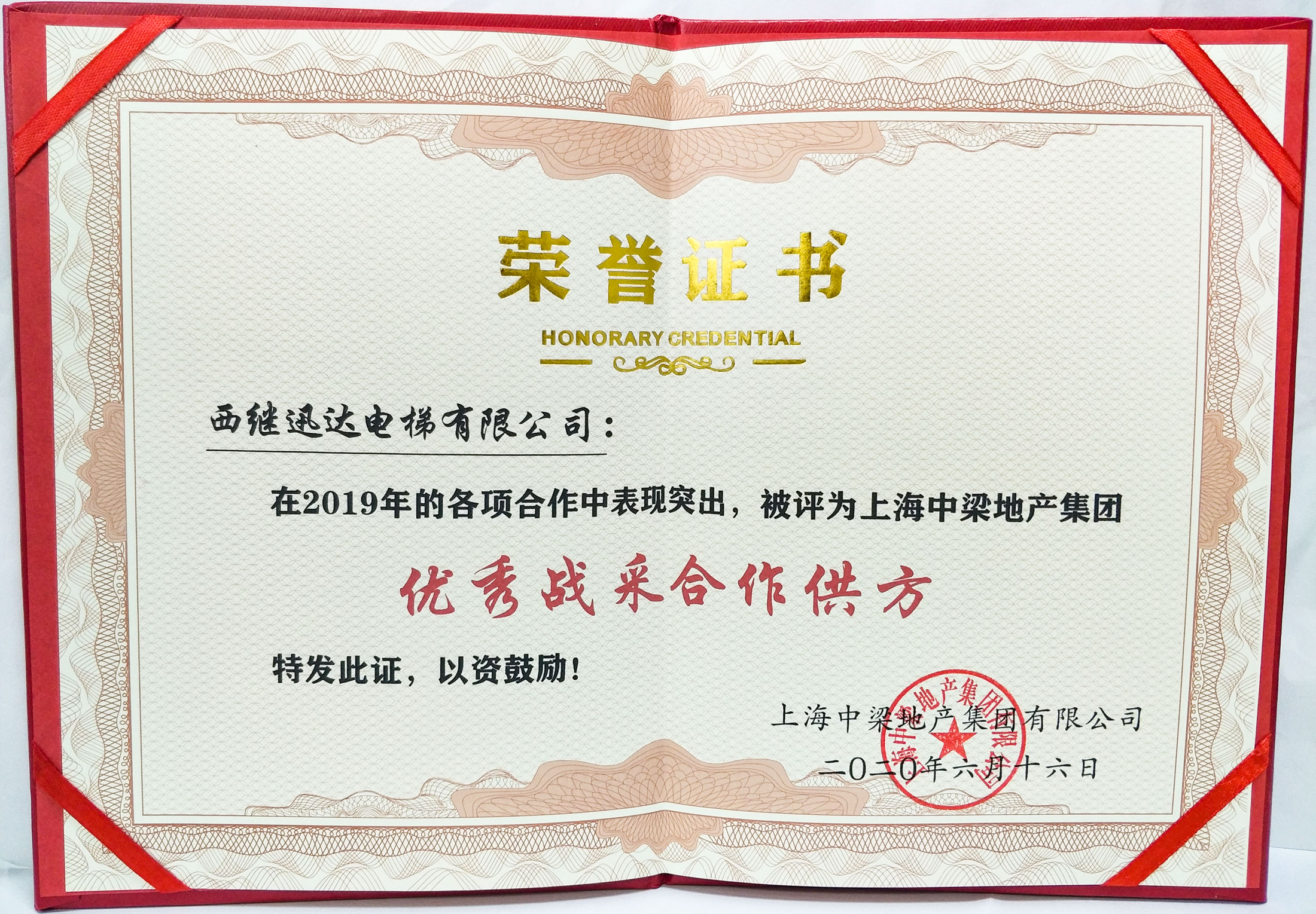 西繼迅達被評為中梁地產年度優秀戰采合作供方