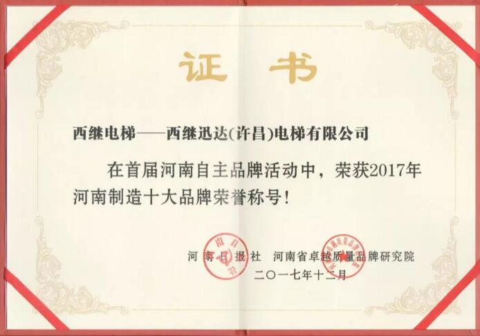 西繼迅達榮膺“2017年度河南制造十大品牌”殊榮